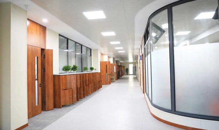 新校區(qū)走廊開(kāi)闊而雅致,褐色條狀木構(gòu)建的棚頂沉穩(wěn)大氣,嵌入式長(zhǎng)方形吸頂燈除去了繁雜的裝飾,突出簡(jiǎn)約至上的理念。