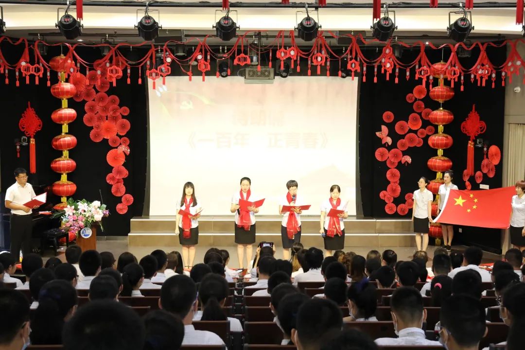 接下來,由欒麗宏、朱茜、李穎、白樹臣四位黨員教師代表帶來了題為 《一百年,正青春》 的詩朗誦。