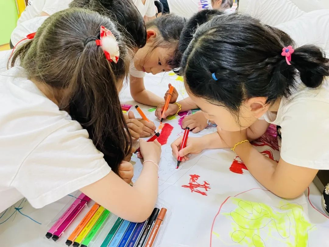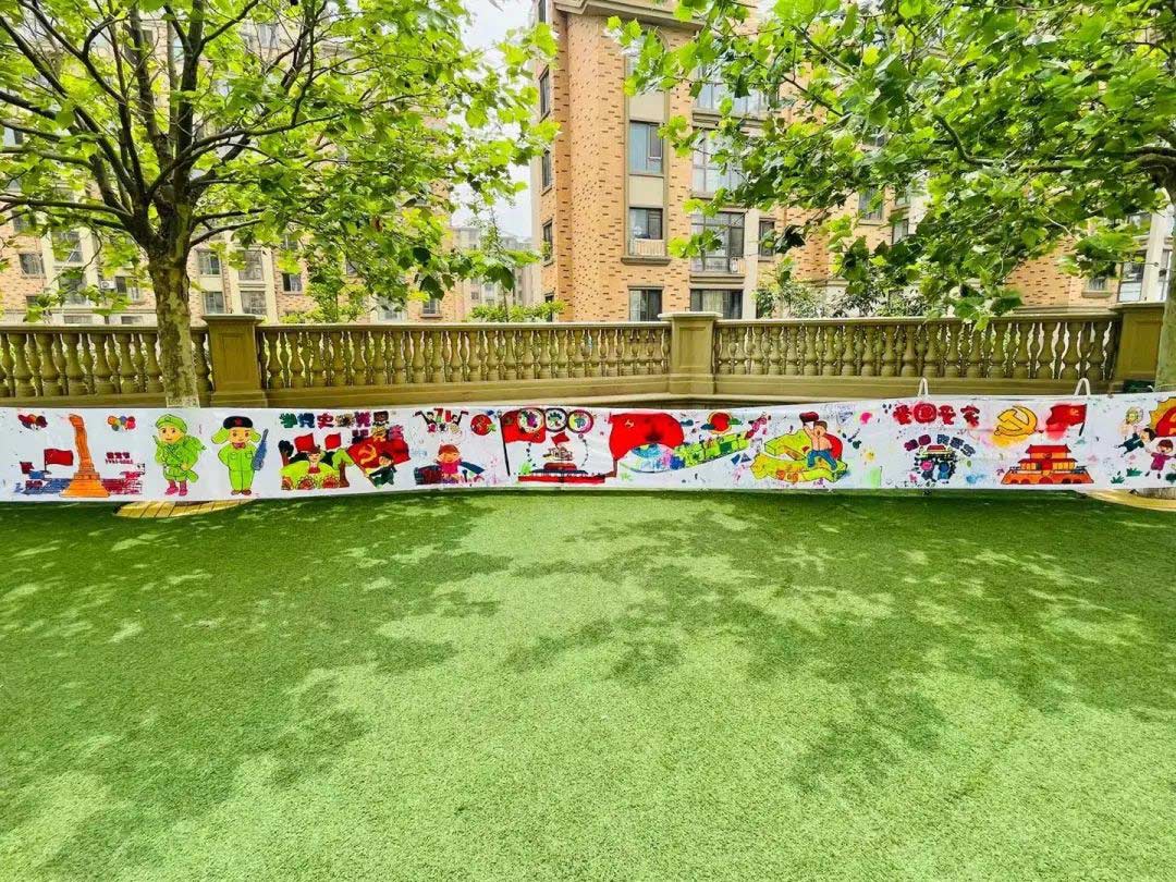 小朋友們俯下身子,手拿畫筆,用靈巧的雙手在畫布上創(chuàng)作,畫面的色彩搭配。雄偉壯觀的天安門廣場、英姿颯爽的國旗護衛(wèi)隊、鮮艷的五星紅旗和黨旗……一筆一畫深情地表達出對黨的感恩之情和對祖國的美好祝愿。經(jīng)過小朋友們精心繪制,一幅滿含深情的作品呈現(xiàn)在大家眼前,訴說著 「我的童心永向黨,我的熱愛獻祖國 」 的心聲。