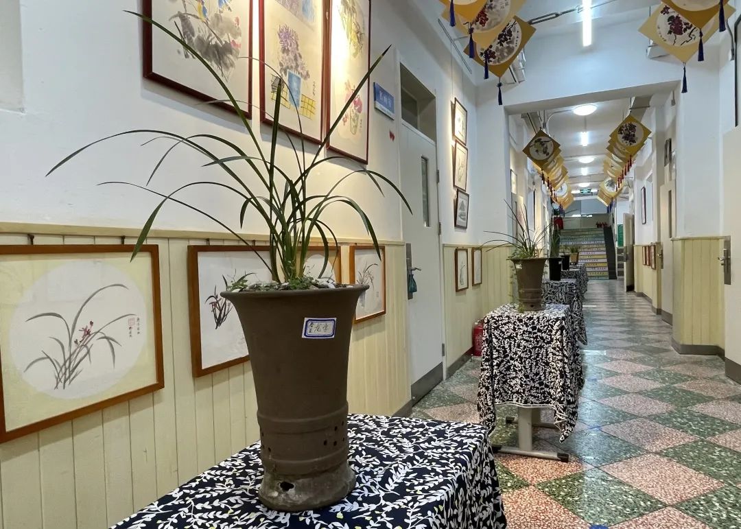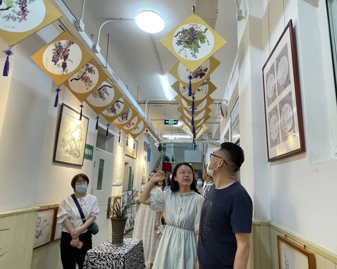 一樓傳統(tǒng)文化長廊一展區(qū)展出了以花鳥畫為主要內(nèi)容的蘭花主題作品,空中懸掛?;ㄗ咸偌按泶T果累累的葡萄為內(nèi)容的國畫作品。