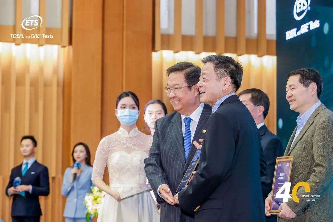 ▲?中國教育國際交流協(xié)會會長劉利民 (右四) 為 「托福中國 40 年 40 人」 榜單獲獎代表頒獎