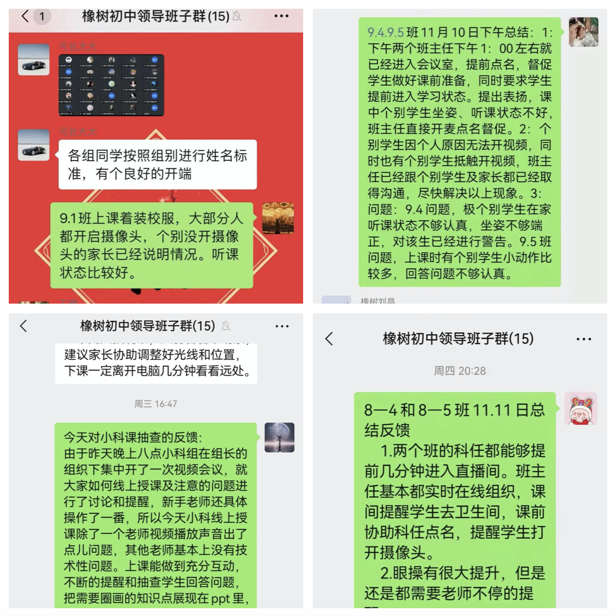 領(lǐng)導(dǎo)班子組成員在騰訊軟件分別登錄不同班級(jí),實(shí)時(shí)監(jiān)控,時(shí)事匯報(bào),做好網(wǎng)課的相關(guān)管理工作,及時(shí)了解和發(fā)現(xiàn)教學(xué)中的問題,幫助老師解決教學(xué)中的困難,了解和解決學(xué)生、學(xué)生家長對(duì)網(wǎng)課的意見和建議。