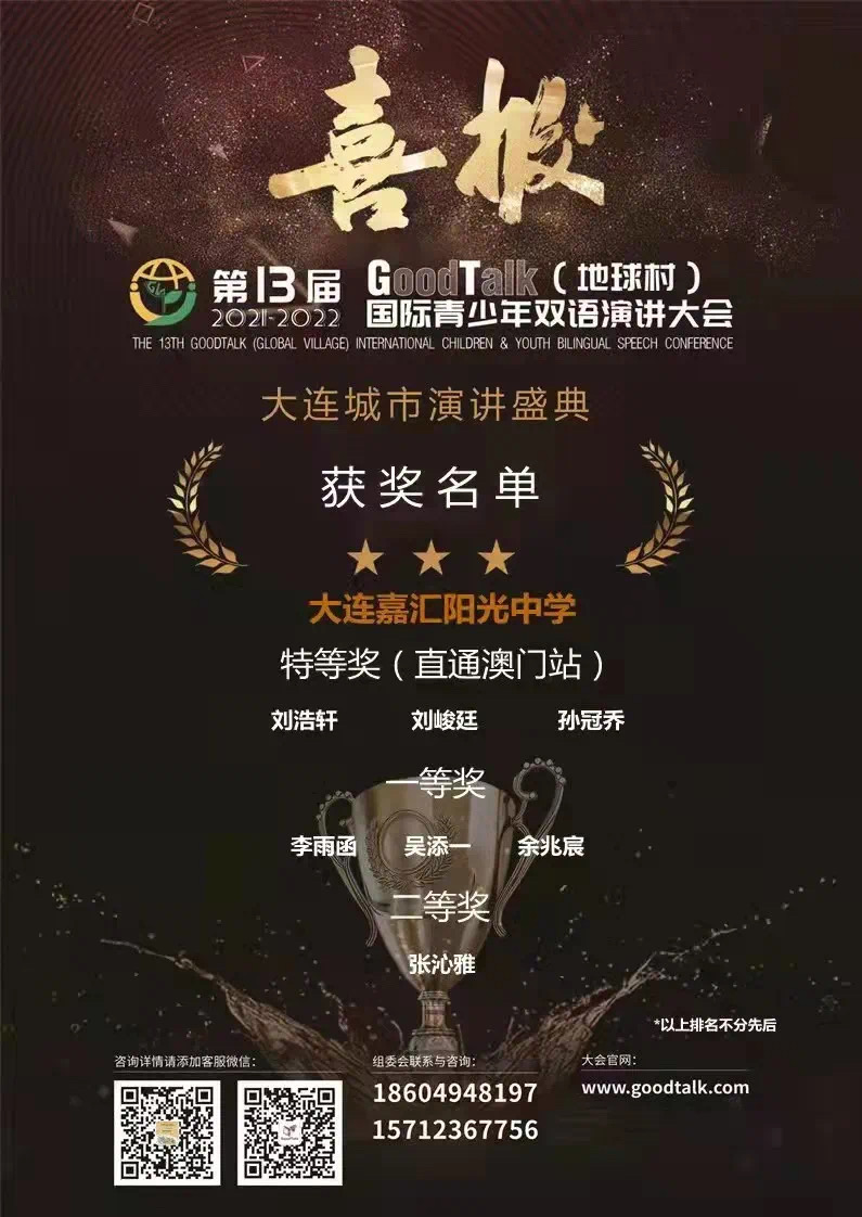 在第 13 屆 Good Talk(地球村) 國(guó)際青少年雙語(yǔ)演講大賽大連賽區(qū)決賽中,我校共十二名學(xué)生參加城市決賽賽,七名學(xué)生獲獎(jiǎng)!