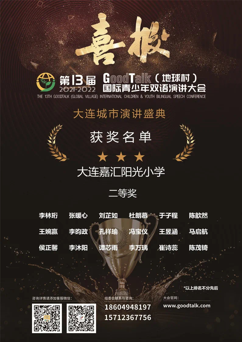 「地球村」 青少年雙語演講大賽,旨在傳播 「中國學生世界化,世界學生中國話」 的文化交融理念。給學生們提供了更多交流的機會,結(jié)交異國朋友,互相了解彼此國家文化,真正實現(xiàn)文化的交融與碰撞。我們的選手未來將以自信的姿態(tài)站在國際舞臺上展示自己,在比賽逐漸成長,收獲果實!