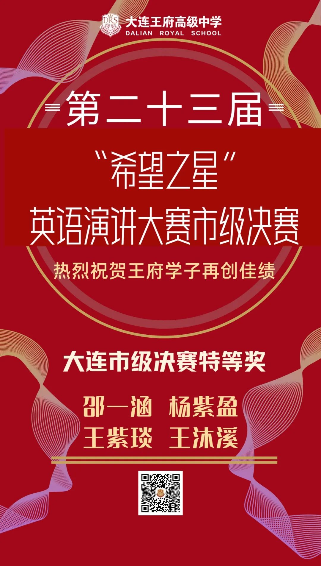 在第二十三屆 「希望之星」 英語演講大賽中,經(jīng)過初賽,復(fù)賽,決賽近三個月的評選,我校國際部高一年級邵一涵、楊紫盈,王紫琰,高二年級王沐溪四名同學(xué)憑借出色的表現(xiàn),獲得市級決賽特等獎并成功晉級省賽。