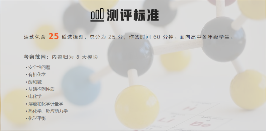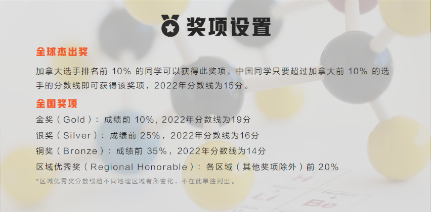 加拿大化學(xué)測(cè)評(píng)由加拿大化學(xué)學(xué)會(huì) (Chemical Institute of Canada,簡(jiǎn)稱 CIC) 主辦,是加拿大學(xué)術(shù)性最權(quán)威的化學(xué)測(cè)評(píng)活動(dòng)之一。同時(shí),「加拿大化學(xué)測(cè)評(píng) (CCC)」 也是 「加拿大化學(xué)測(cè)評(píng) (高級(jí) CCO)」 的全國(guó)選拔預(yù)選,獲獎(jiǎng)選手將會(huì)獲邀參加 「加拿大化學(xué)測(cè)評(píng) (高級(jí) CCO)」 。加拿大化學(xué)測(cè)評(píng)系列作為加拿大頂級(jí)的化學(xué)學(xué)術(shù)活動(dòng),讓化學(xué)愛好者體驗(yàn)化學(xué)的美麗,鍛煉化學(xué)學(xué)科思維,為全球優(yōu)秀高中生提供展現(xiàn)能力的平臺(tái)。