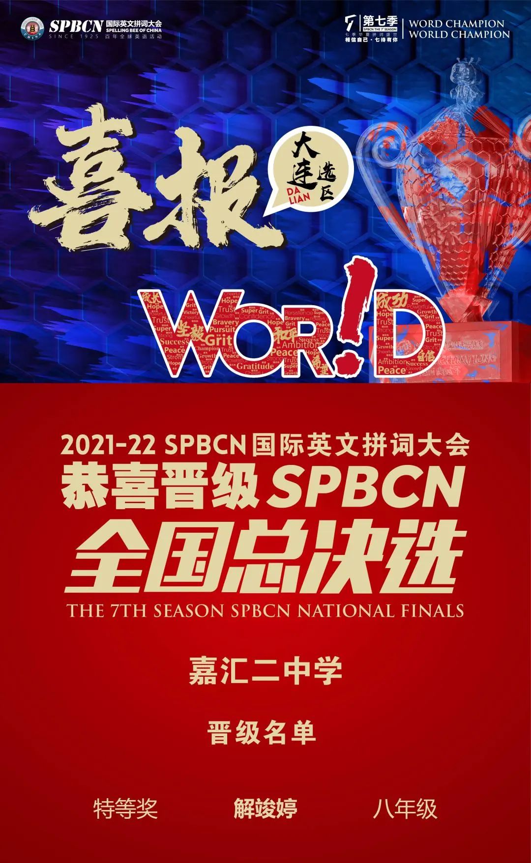 祝賀嘉匯二中二年四班解竣婷同學(xué),在 SPBCN 國際英文拼詞大會全國總決賽中一路過關(guān)斬將榮獲 「特等獎」!