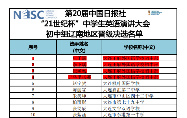 在 6 月 25 日剛結(jié)束的第 20 屆中國日?qǐng)?bào)社 「21 世紀(jì)杯」 中學(xué)生英語演講比賽初中組遼南賽區(qū)的比賽中,我校學(xué)生再獲佳績(jī)。大連王府外國語學(xué)校初中雙語班 7 年 4 班莊子遙、 8 年 1 班李下蹊、雙語班 8 年 7 班崔涵暢、雙語班 8 年 6 班于烏里揚(yáng)娜四位選手包攬遼南賽區(qū)復(fù)賽前 4 名,向決賽進(jìn)軍!