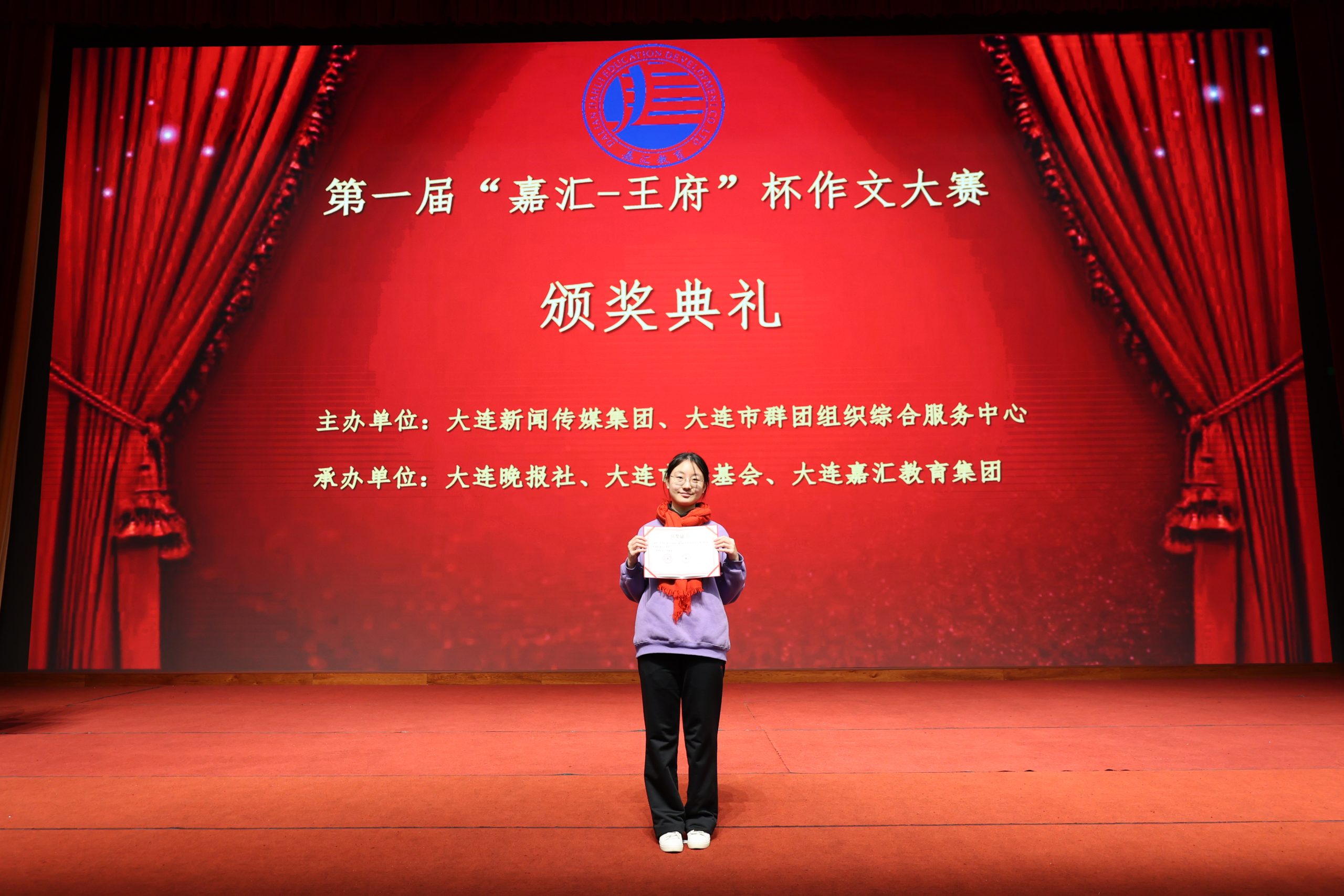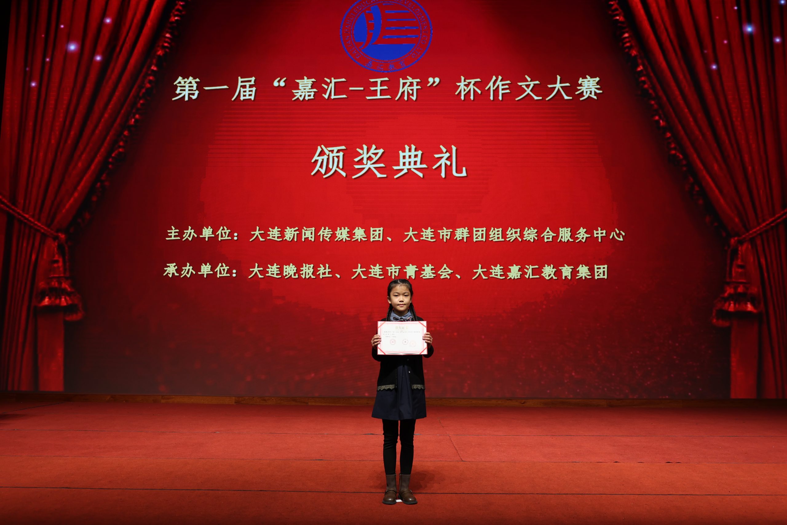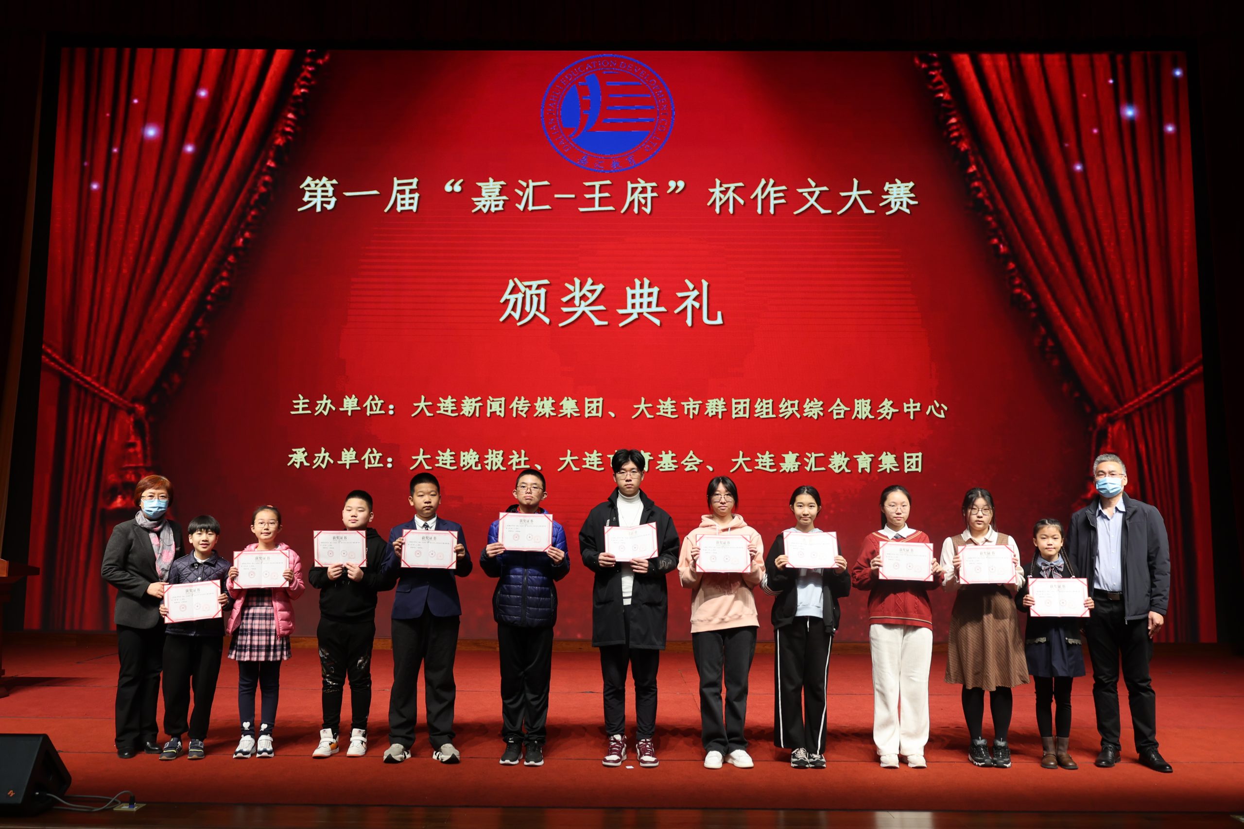 11 月 20 日,由大連新聞傳媒集團(tuán)、大連市群團(tuán)組織綜合服務(wù)中心主辦,大連晚報(bào)社、大連市青基會(huì)、大連嘉匯教育集團(tuán)承辦的 「嘉匯-王府杯」 第一屆全市中小學(xué)生寫作大賽頒獎(jiǎng)儀式在高新區(qū)大連王府高級(jí)中學(xué)舉行。大連市素質(zhì)教育研究會(huì)會(huì)長韓巍、嘉匯教育集團(tuán)教育教學(xué)部副部長高自發(fā)為本次大賽獲獎(jiǎng)選手和優(yōu)秀指導(dǎo)教師頒發(fā)了證書及獎(jiǎng)金。