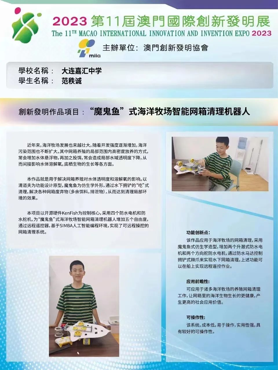 近日,在第 11 屆澳門國際創(chuàng)新發(fā)明展活動中,大連嘉匯中學(xué)學(xué)子發(fā)明作品 「『魔鬼魚』 式海洋牧場智能網(wǎng)箱清理機(jī)器人」 項目,榮獲本屆展會創(chuàng)新發(fā)明金獎。