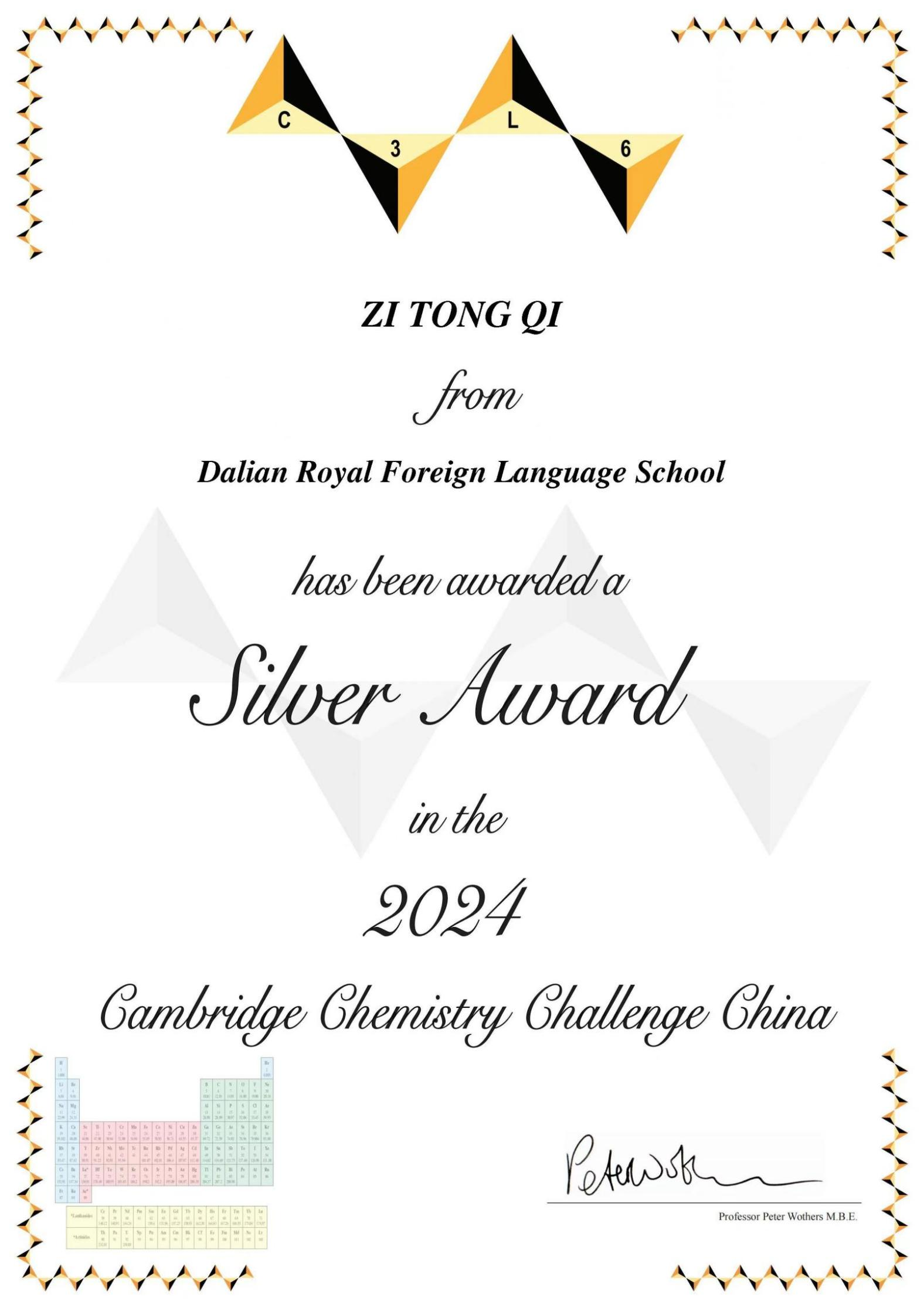 近日,大連王府外國(guó)語(yǔ)學(xué)校初中部連獲喜訊。在 2024 劍橋化學(xué)測(cè)評(píng) (C3L6) 中,八年級(jí)雙語(yǔ)班齊梓彤同學(xué)榮獲全球銀獎(jiǎng),并獲得劍橋化學(xué)挑戰(zhàn)集訓(xùn)營(yíng)入營(yíng)資格。