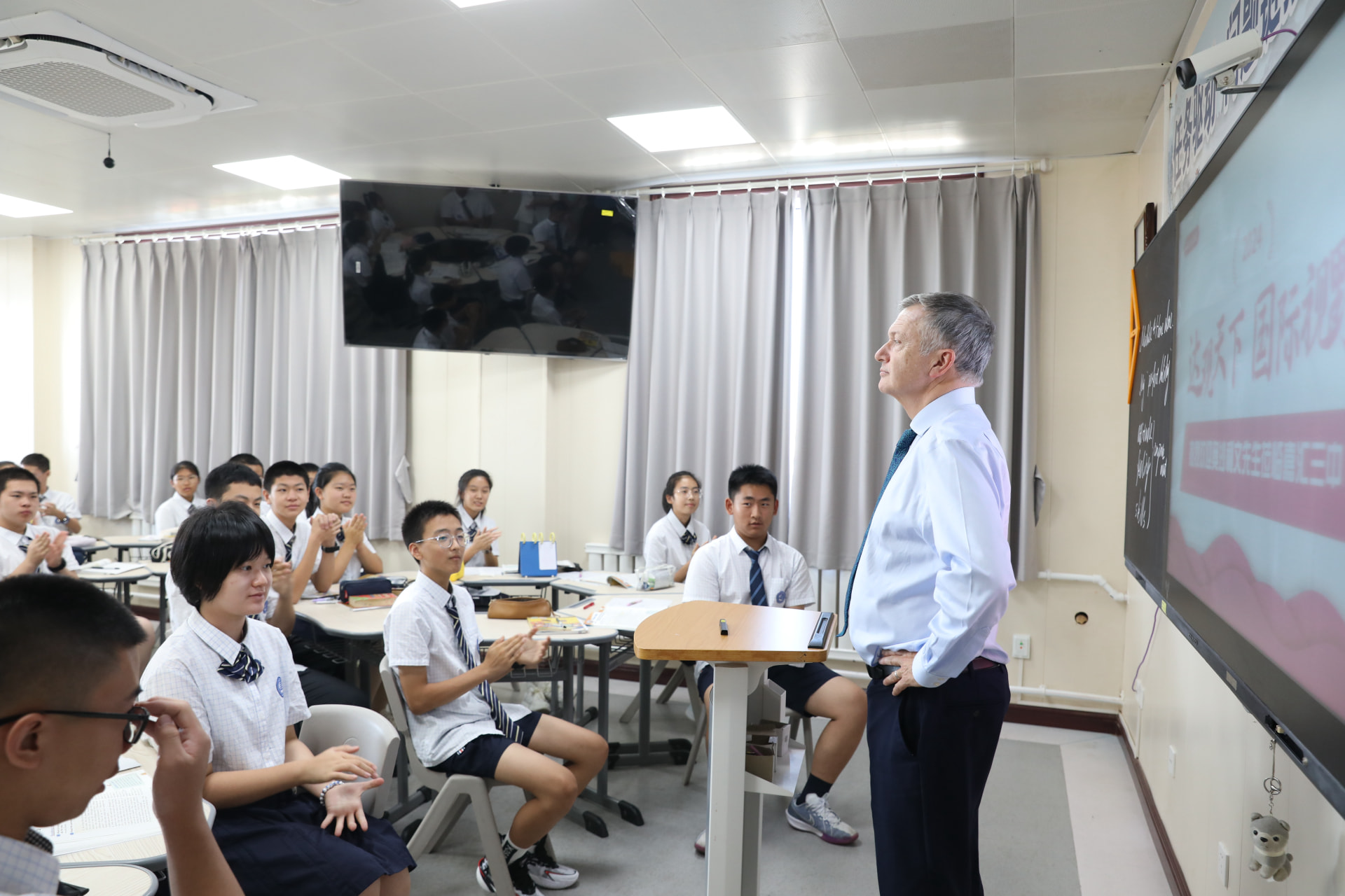 各校研討會(huì)中,奧沙利文先生通過(guò)多年來(lái)在中、英兩地的教學(xué)經(jīng)驗(yàn)和工作經(jīng)歷,與在座老師分享了他對(duì)國(guó)際課程和英語(yǔ)學(xué)習(xí)的見解,針對(duì)老師們提出的關(guān)于激發(fā)教師教學(xué)熱情和如何拓展學(xué)生國(guó)際視野等問(wèn)題,奧沙利文先生給予了詳盡的指導(dǎo)和解答。