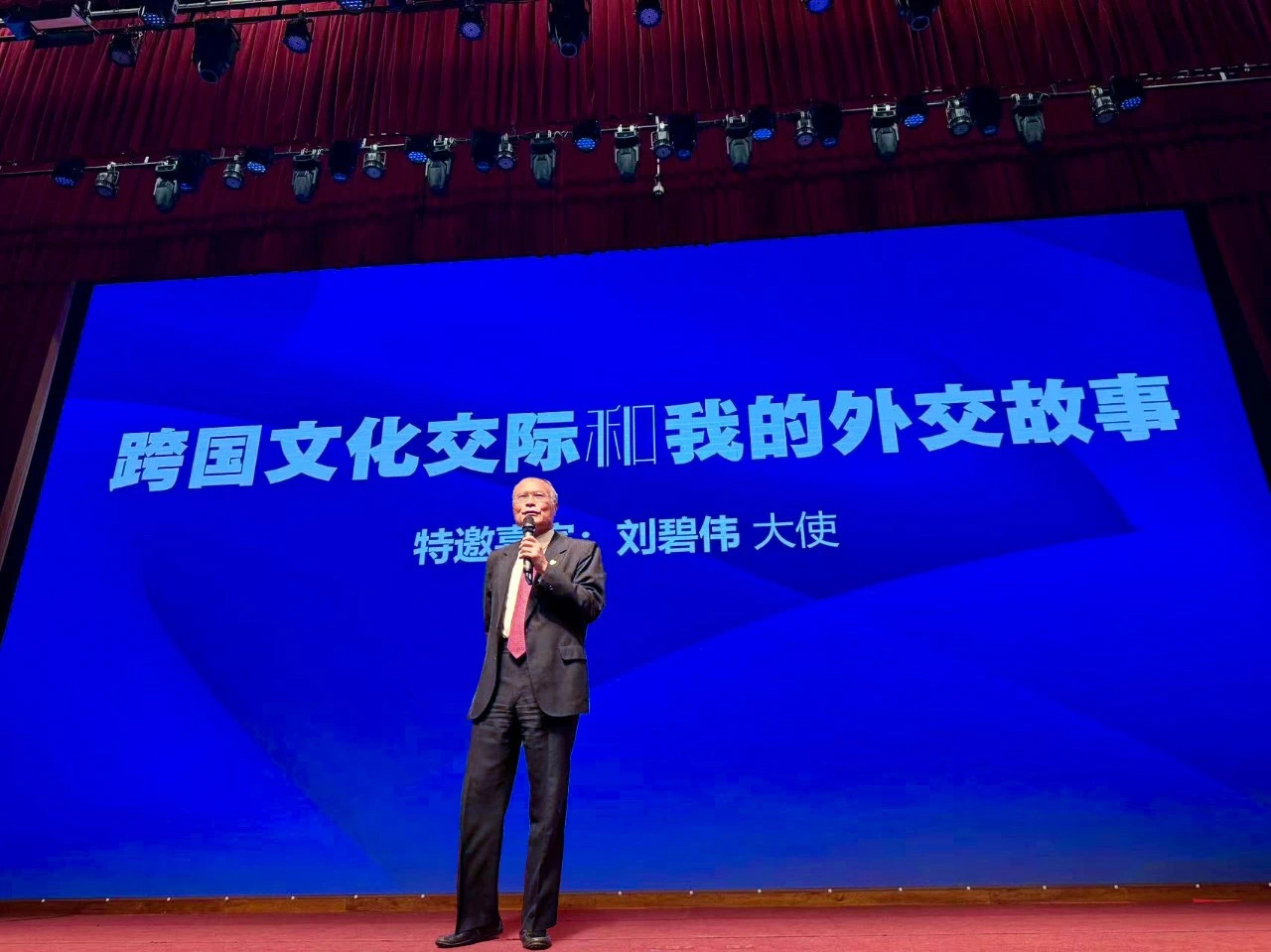 隨后,在 《跨國(guó)文化交際和我的外交故事》 主題講座中,劉碧偉大使結(jié)合駐外生涯和豐富的外交工作經(jīng)驗(yàn),分享了美國(guó)、愛(ài)爾蘭、丹麥、埃塞俄比亞、老撾等歐美和亞非國(guó)家的風(fēng)土人情及外交工作感悟。同時(shí),他還向大家展示了承載著時(shí)代記憶的照片并分享了背后精彩的駐外見(jiàn)聞,使師生們更加直觀地了解跨文化交際、外交工作事務(wù)的真實(shí)面貌,體現(xiàn)了一名外交官的國(guó)際視野和嚴(yán)謹(jǐn)睿智的品質(zhì),同時(shí)也點(diǎn)燃了大家對(duì)外交事業(yè)的的熱情。