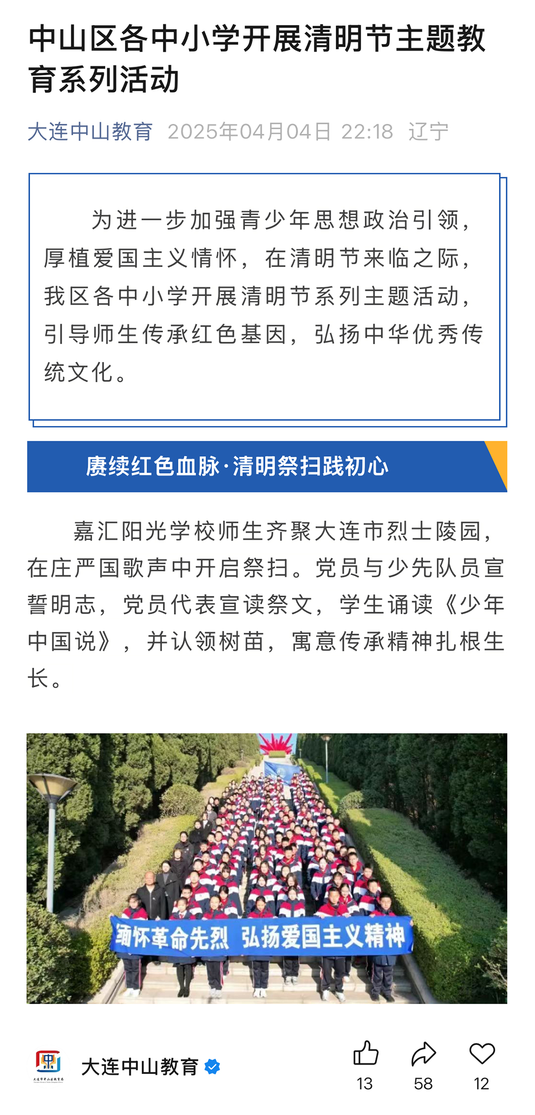 大連市中山區(qū)教育局在大連中山教育公眾號中報(bào)道嘉匯陽光學(xué)校烈士祭祀活動(dòng)。