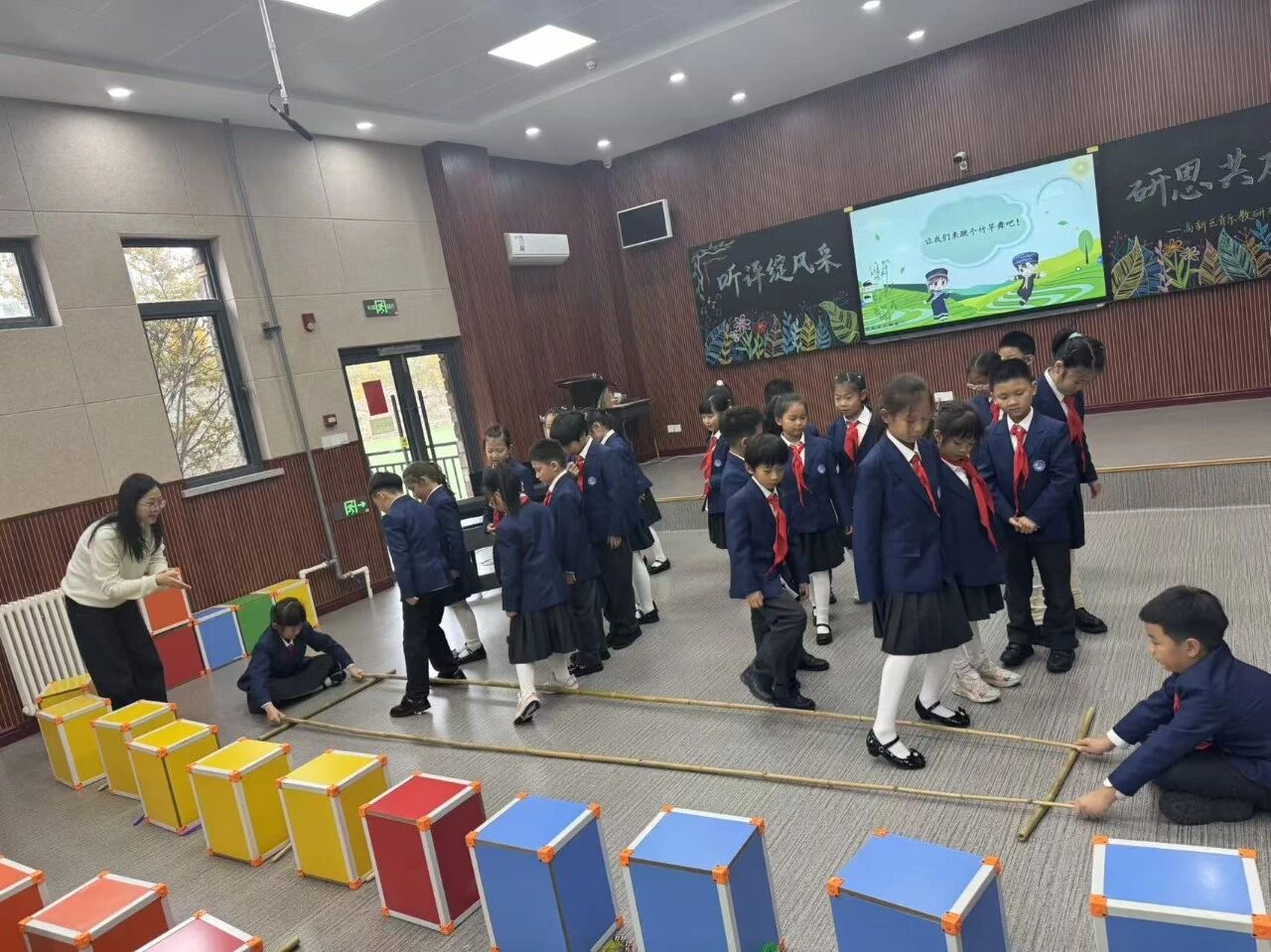 最精彩的當(dāng)屬 「樂器創(chuàng)編」 和跳竹竿舞環(huán)節(jié):王姍姍老師為學(xué)生分發(fā)沙槌、串鈴、竹竿簡易樂器,讓學(xué)生分組為歌曲伴奏。 「第一組用沙槌,第二組用串鈴,第三組用短竹竿,我們一起為哈尼族小伙伴的 『上山破竹筒』 之旅伴奏!」 在王姍姍老師的引導(dǎo)下,學(xué)生不僅了解到哈尼族的服飾是五彩斑斕的,還了解到哈尼族人民是能歌善舞的,他們擅長跳竹竿舞。通過視頻介紹,王姍姍老師帶領(lǐng)學(xué)生們學(xué)跳了簡單的竹竿舞的動作。教室里仿佛變成了熱鬧的哈尼族村寨,學(xué)生們在玩中學(xué)、樂中悟,深刻體會到哈尼族族音樂的活潑韻味。